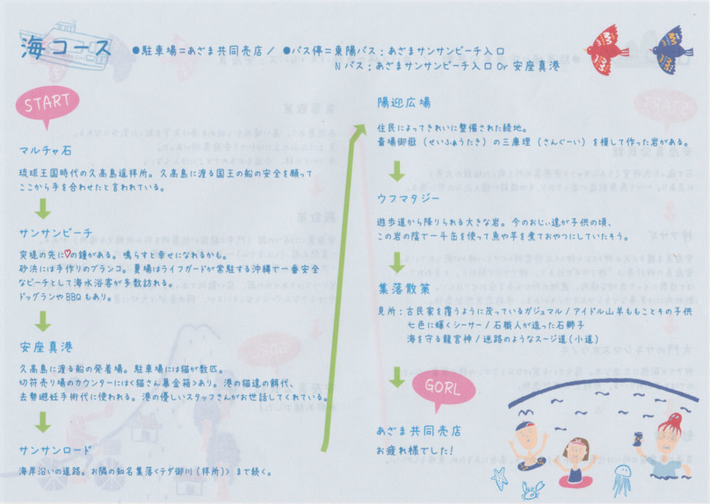 あざまサンサンビーチや久高島フェリー乗り場を利用したことがあるという方も多いと思いますが、地元の人しか知らない文化財やオススメスポットにショップ情報をまとめた「azamap」
